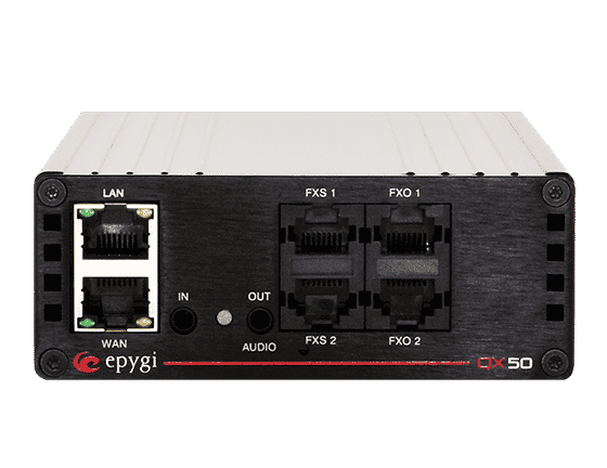 The Epygi QX50 IP PBX is ideal for small businesses, with up to 50 extensions. Out of the box, this solution includes two FXO analog PSTN connections, two FXS analog station ports, and 16 extensions.