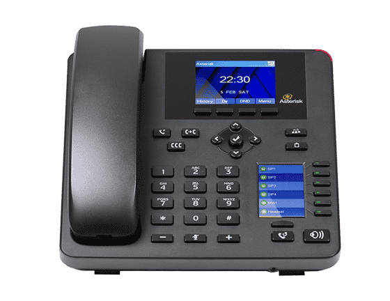 The Digium A25 IP Phone is a mid-level gigabit phone with four-line registrations, two full-color LCD displays, and a scroll key that allows you to access up to 30 contacts.