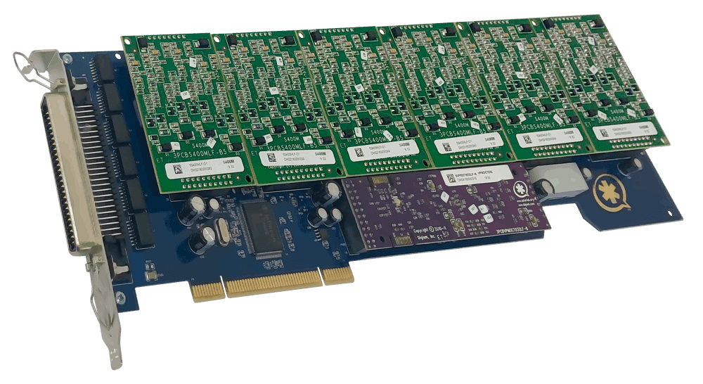 The Sangoma 2400 series analog telephony card can accommodate up to six quad port station or trunk modules for a total of 24 lines, making them ideal for larger installations or channel bank replacement. The Sangoma 2400 series are full-length PCI-Express 1.0 VoIP PBX hardware cards that connect analog telephone stations and analog POTS lines to a PC.