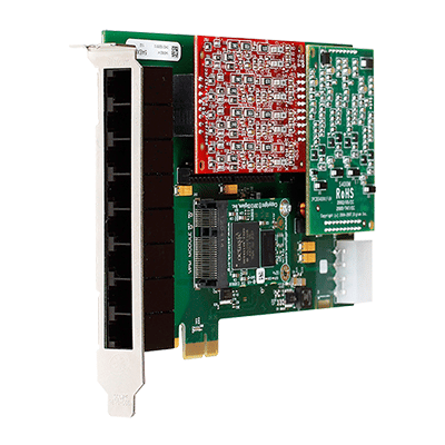 The A8 Series analog cards from Digium can support up to eight RJ11 connections per board. Digium's cutting-edge quad-port interface modules allow A8 Series cards to scale from one to eight ports. Because the cards are modular, you can mix and match line (FXO) and station (FXS) interfaces to get the exact ports you require.